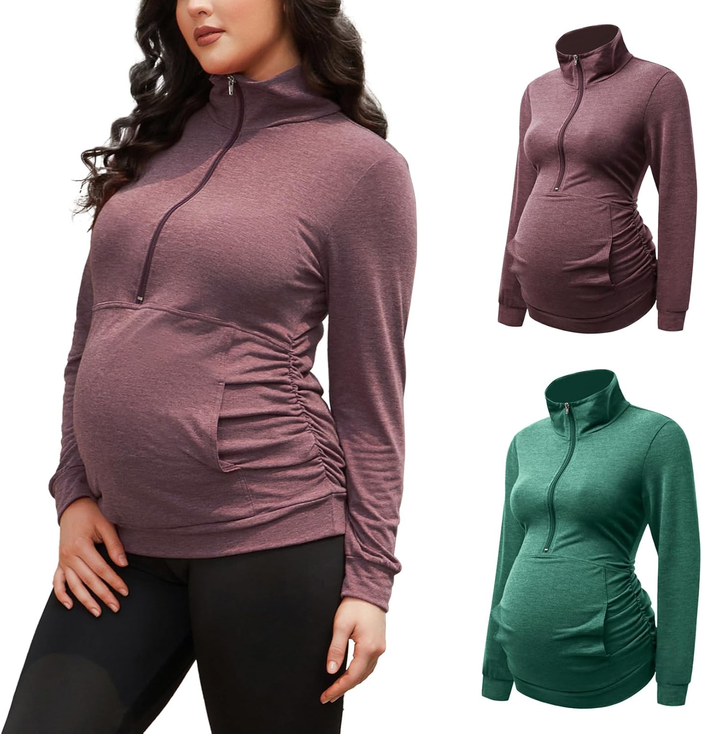 GINKANA Maternity Women's Long Sleeve Shirt Half Zipper Lapel Lightweight Casual Maternity Pullover with Pockets