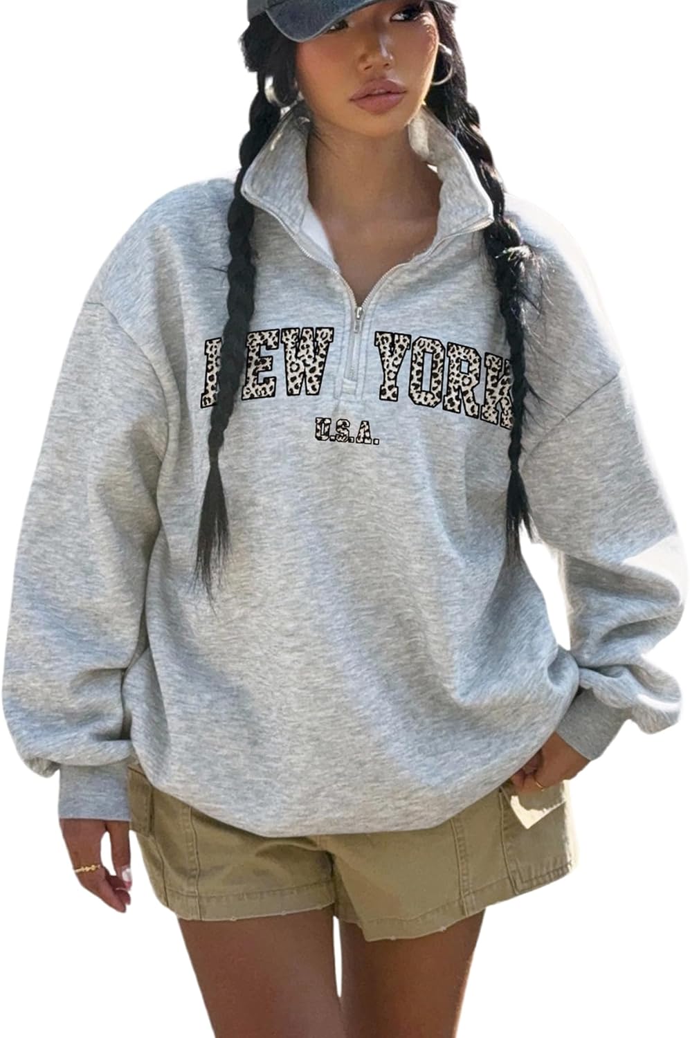 OYOANGLE Women's Half Zip High Neck Sweatshirts Leopard Letter Graphic Loose Pullover Tops Streetwear