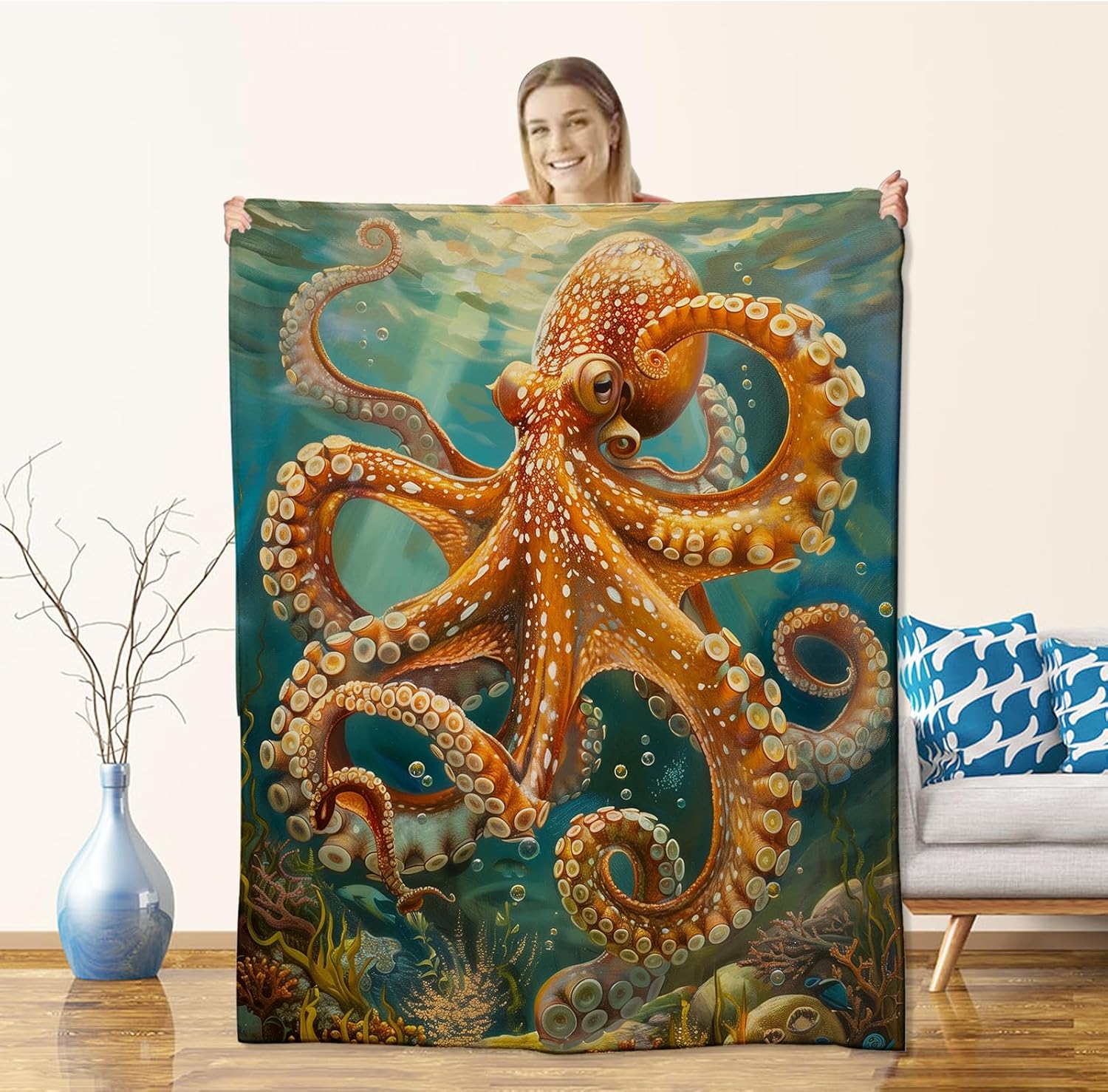 Octopus Blanket for Adults & Kids, Flannel Octopus Throw Blanket for Sofa, Couch, Bed - Soft, Warm & Cozy - Ocean Animal Decor - 60" x 50"