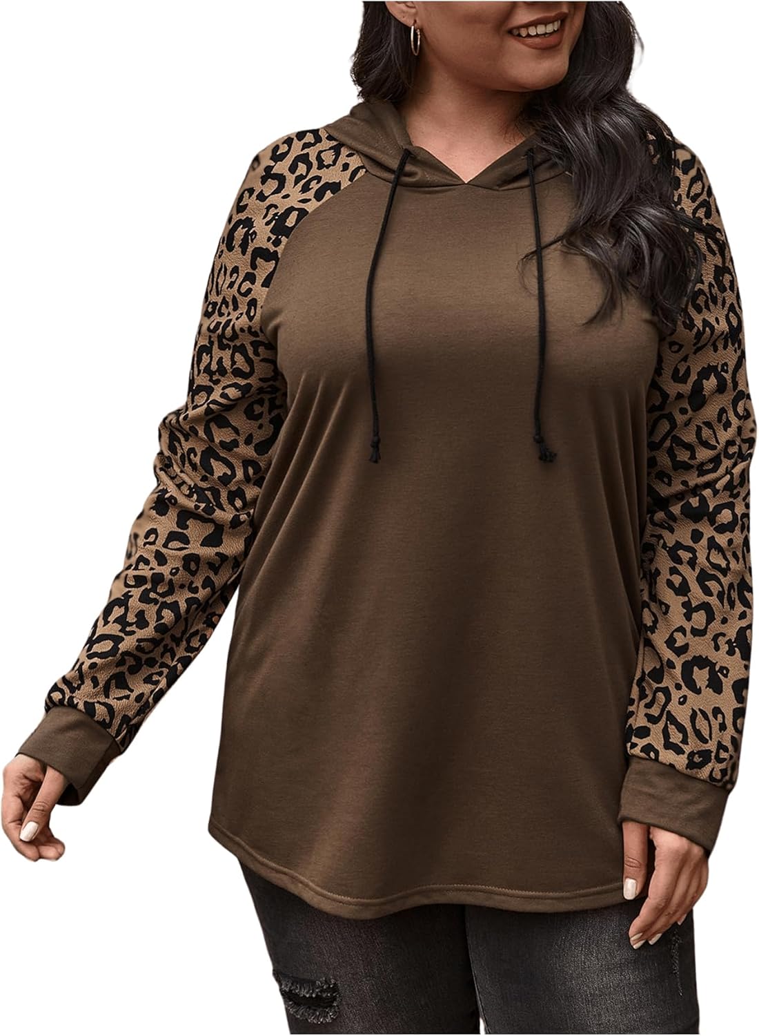 WDIRARA Women's Plus Size Leopard Print Hooded Sweatshirt Drawstring Raglan Sleeve Hoodie