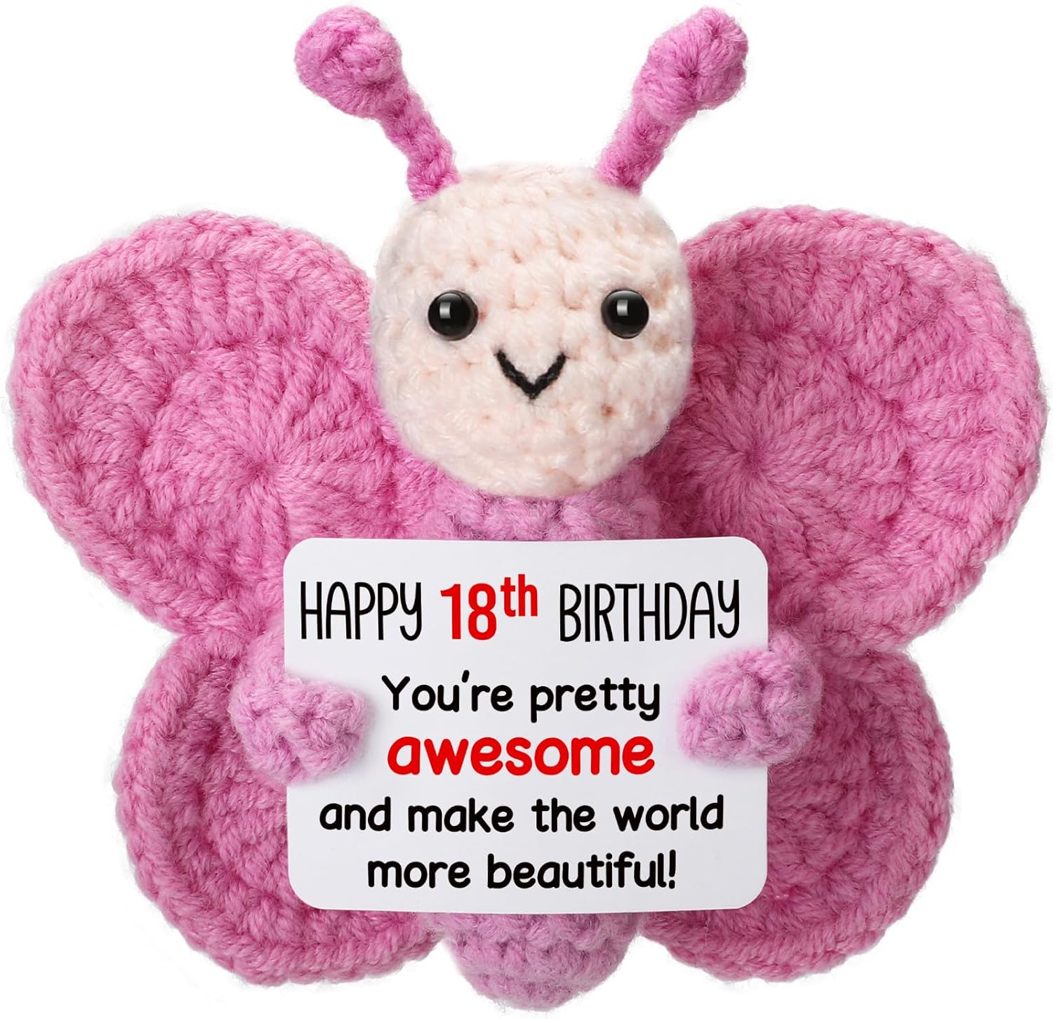 18th Birthday Gifts for Girls, Mini Crochet Pink Butterfly Plush for 18th Birthday Decorations, Happy 18 Year Old Girl Gift Ideas
