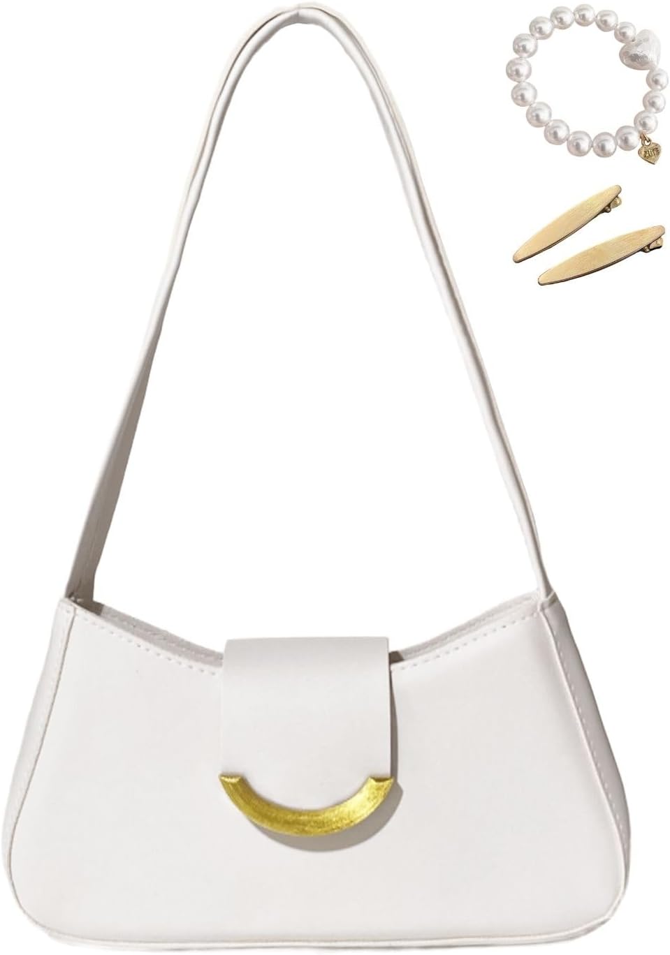 Small Purse for Women White Shoulder Bag Cute Hobo Leather Handbag Underarm Purses with Zipper Gold-Tone Bar Buckle