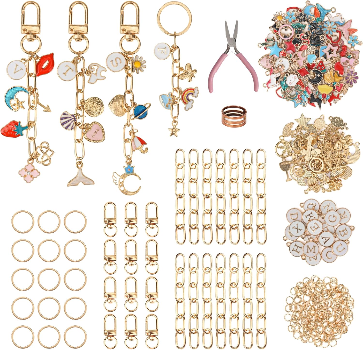 - Various Accessories: 348pcs DIY keychain kit includes 70 colorful charms,30 gold charms,30 extender chains,20 keychain clips,20 key rings,26 letter charms,151 jump rings, and a jump ring tool opener&a jewelry plier. Every piece works together to cover all your keychain crafting needs