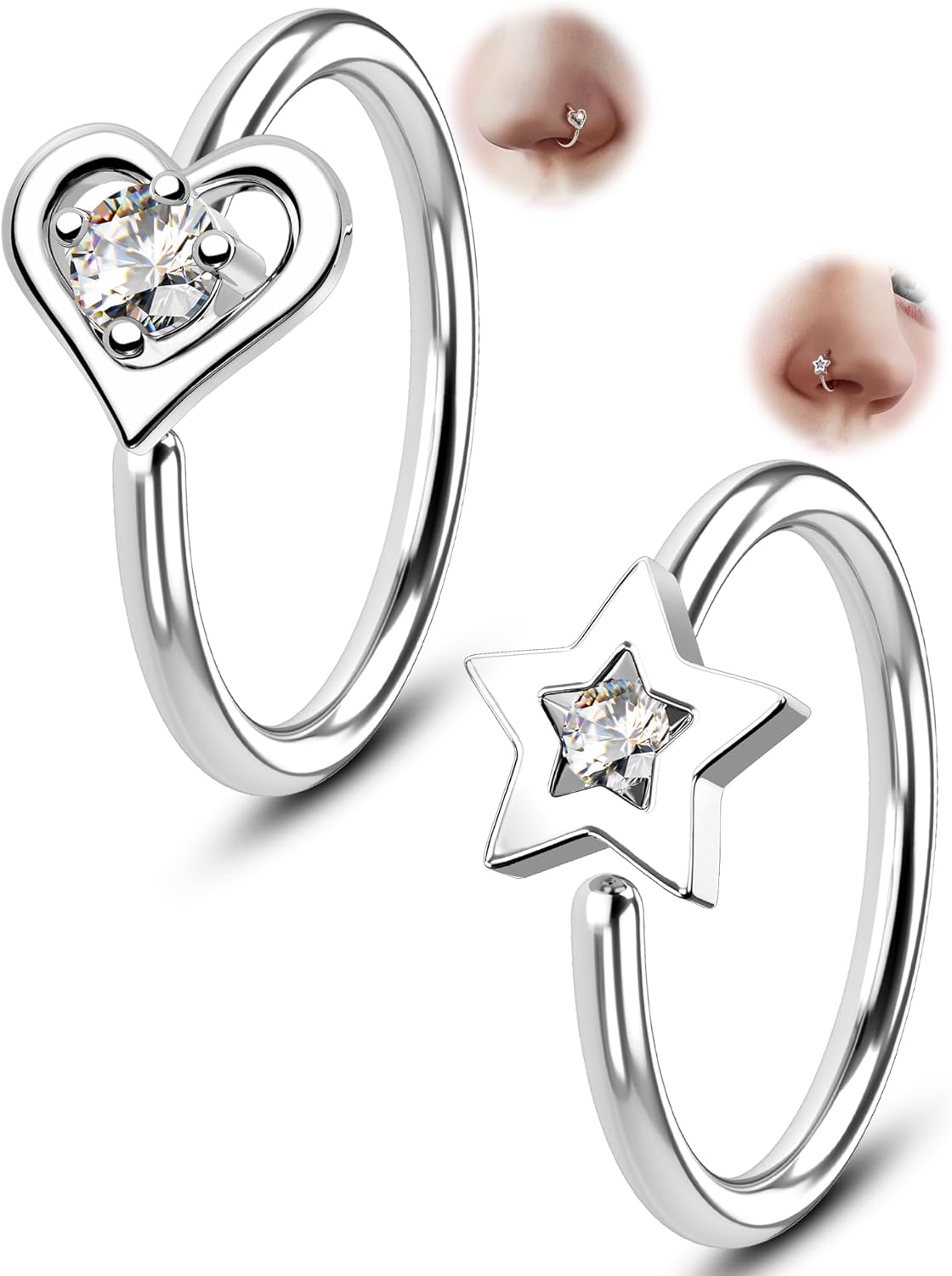Melighting 20G Nose Rings Hoops Set, 316L Stainless Steel Seamless Open Nose Ring, Heart& Star Cartilage Piercing Clear CZ Helix Earrings Nose Septum Labret Piercing for Women 8 mm