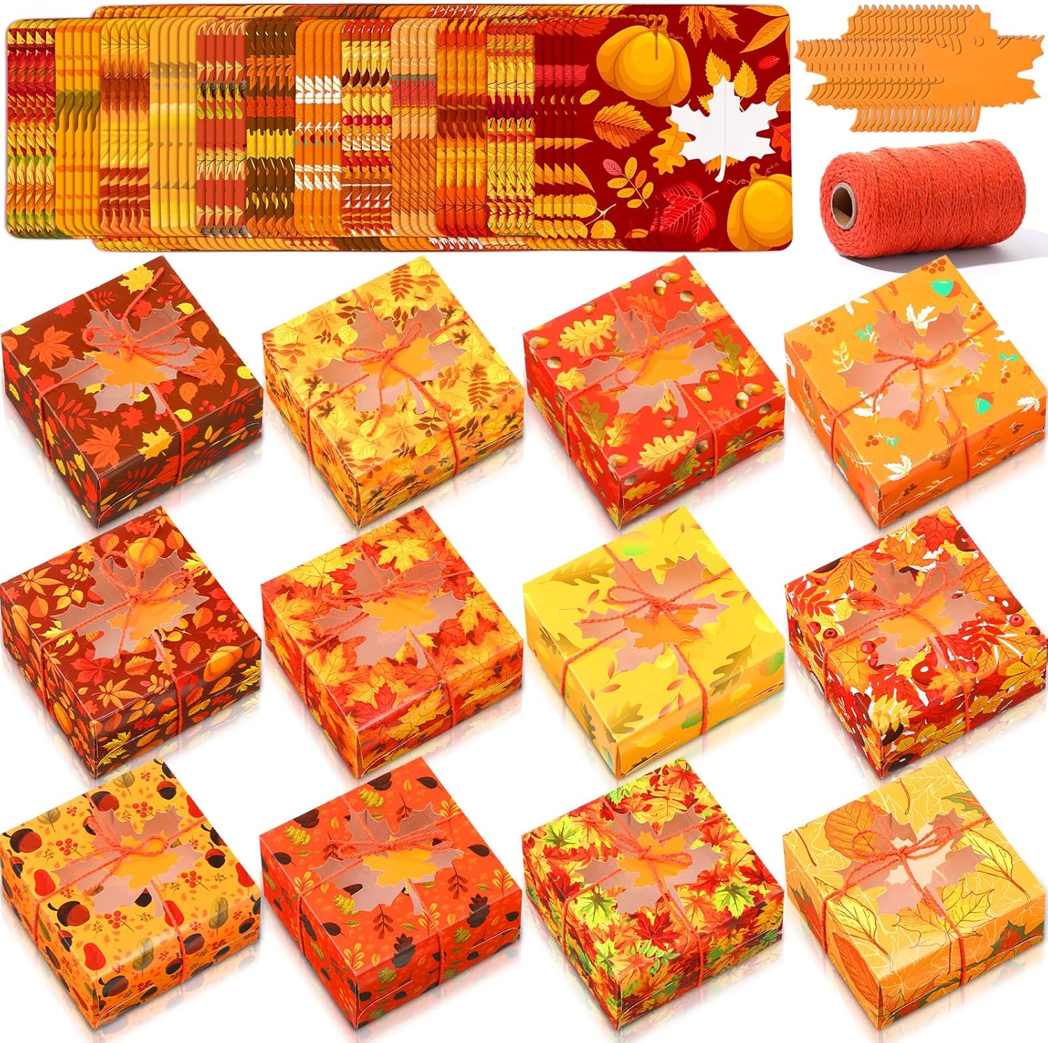 - Sufficient Quantity: you will receive 60 bread boxes, 12 different patterns, 5 of each style, with 60 maple leaf labels and 1 roll of orange cotton rope, sufficient quantity and rich styles, satisfying you to pack cakes during festivals needs