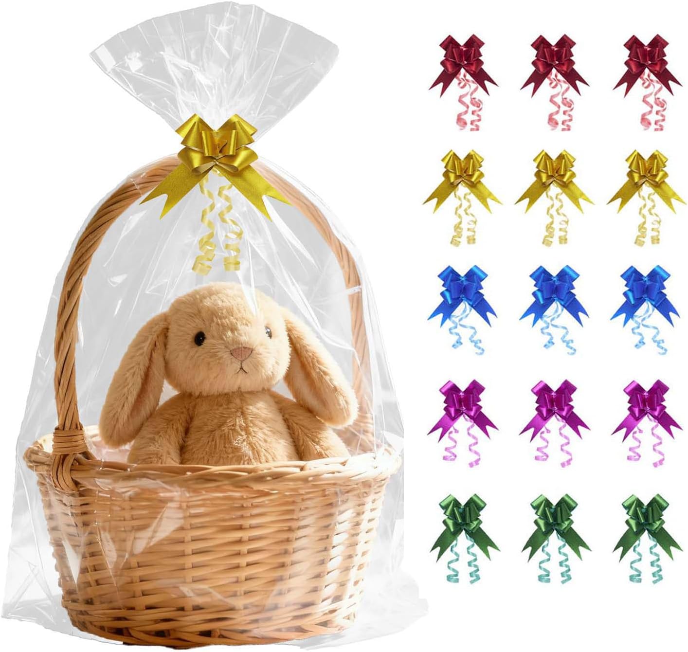 - 【Elegant Gift Presentation】: This set includes 15 colorful pull bows and 13 large 30×40 inch bags. The 15 vibrant pull bows add a luxurious touch to your gifts, making them look more lively and professionally wrapped. Perfect for making any gift stand out and leaving a lasting impression. (Baskets not included)