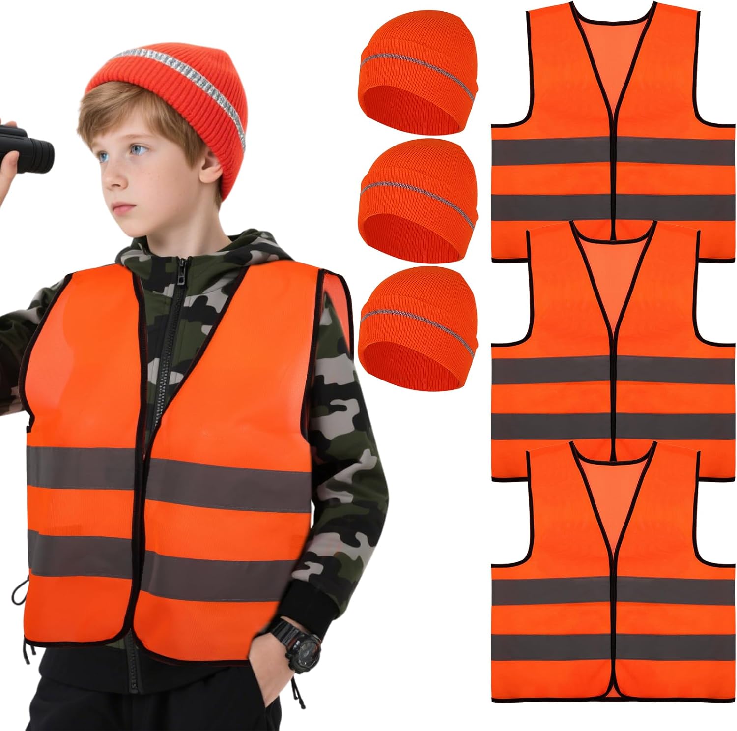 6 Pcs Kids Hunting Vest & Beanie Set Reflective Hunting Clothes Blaze Vests, Deer Hunter Safety Vests and Warm Beanie Costumes with Reflective Strips, Night Hiking Outdoor (Medium,Kids/Youth Size