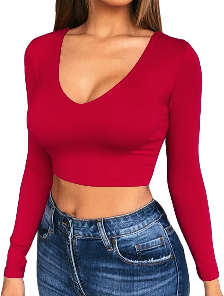 Artfish Women's Long Sleeve Scoop V Neck Crop Top
