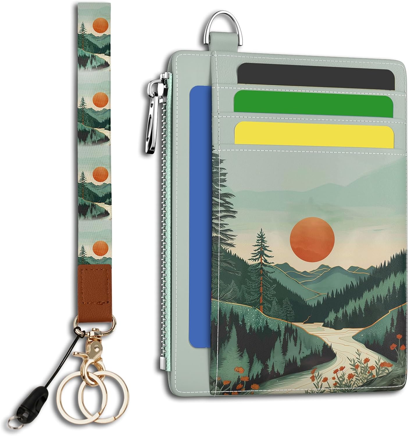 Slim Wallet Women Credit Card Holder, Mountain Tree Sunset RFID Blocking Front Pocket Wallet Wristlet Keychain Lanyard Small Cute Thin Travel Zipper Coin PU Leather Card Case Organizer Gifts
