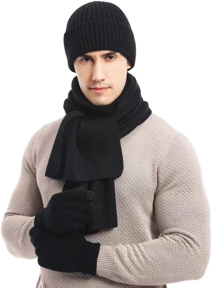 Mens Beanie Scarf Gloves Set Knit Winter Fleece Lining Thick Hat