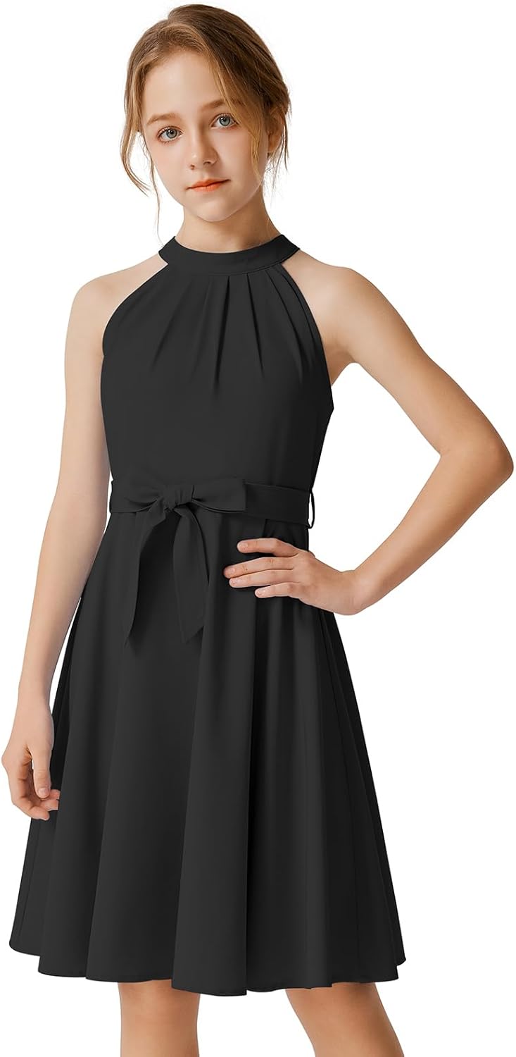 Quedoris Girls Halter Neck Pleated A-line Swing Flared Belted Casual Party Dress with Zipper