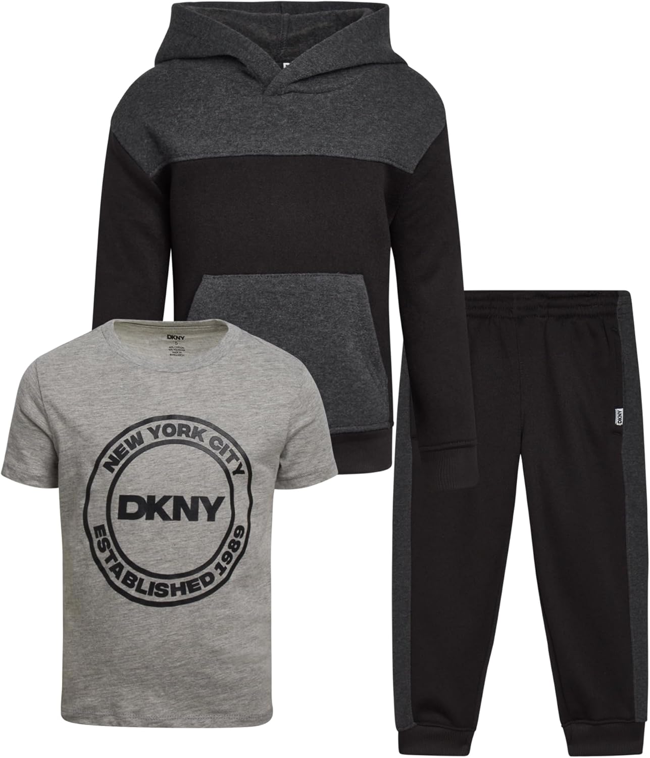 DKNY Toddler Boys' Jogger Set - 3 Piece Short Sleeve Graphic T-Shirt, Pullover Hoodie, and Jogger Sweat Pants (Sizes: 4-7)