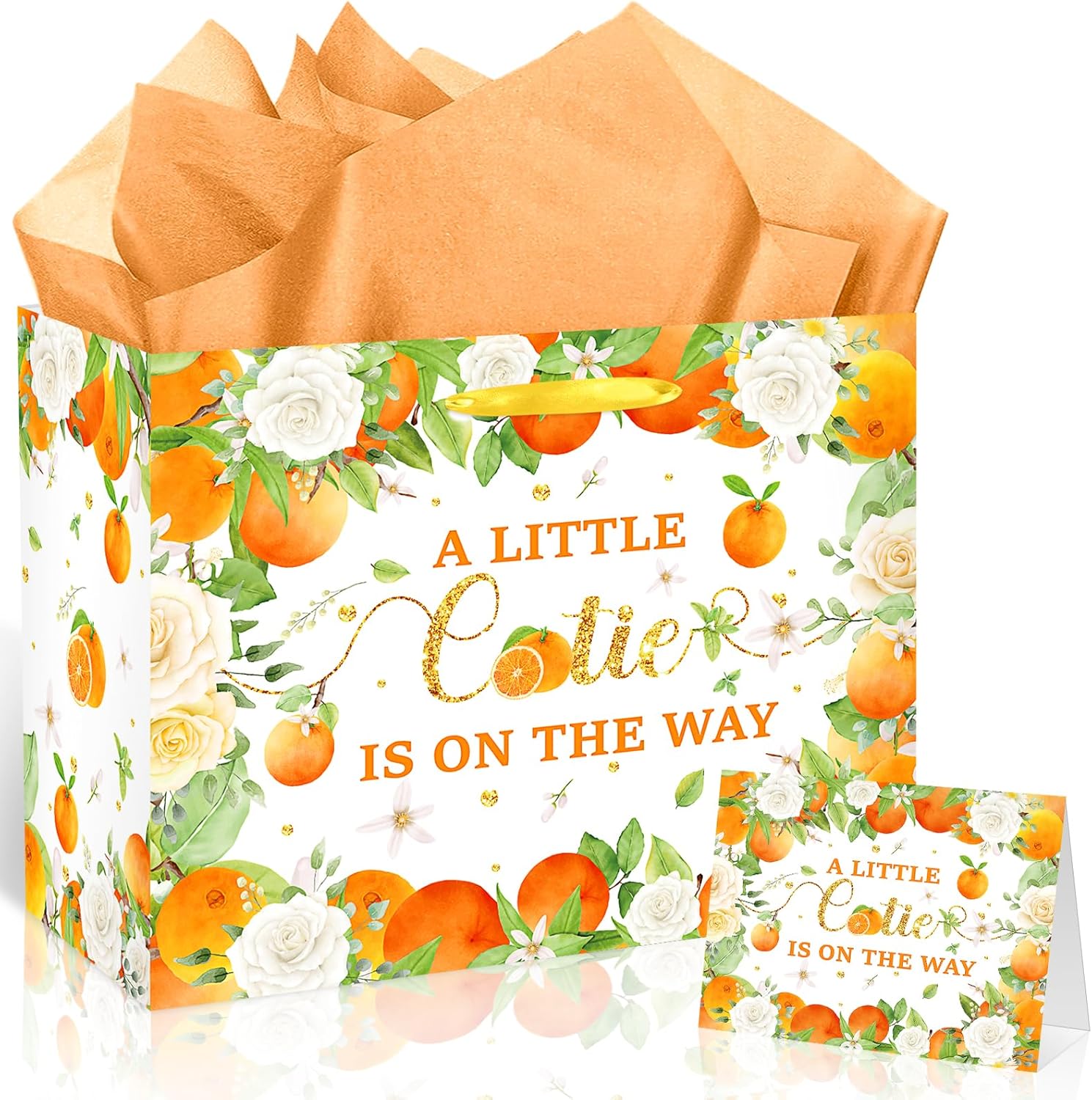 Little Cutie Baby Shower Birthday Gift Bag for Baby Girls Boys A Little Cutie is On The Way Bag with Wrapping Paper Card Orange Floral Gift Bag for Baby Shower Gender Reveal Birthday Party Supplies