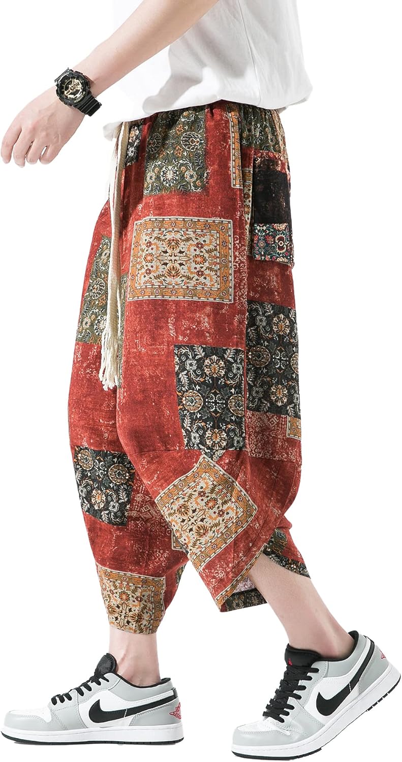 DOSLAVIDA Men's Casual Elastic Waist Linen Capri Pants Wide Leg Baggy Cotton Harem Yoga Trousers Loose Patchwork Short