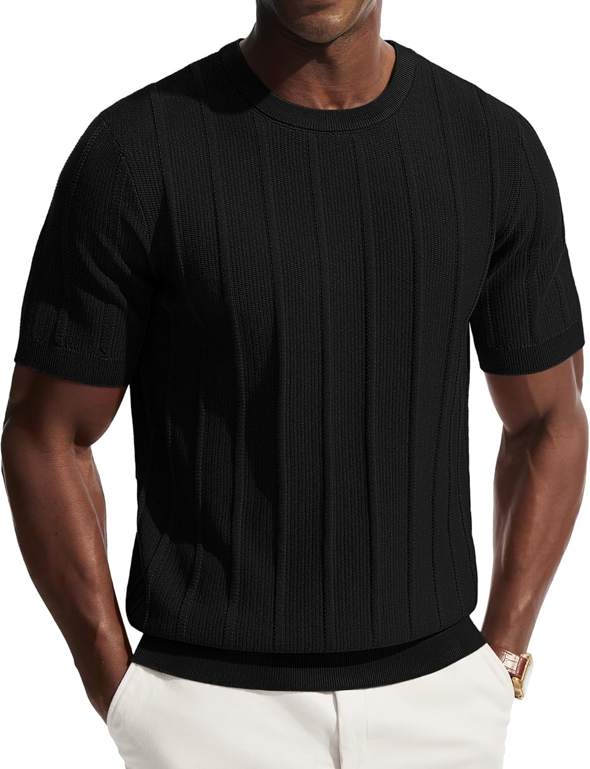 PJ PAUL JONES Men T-Shirts Crewneck Tee Shirt Ribbed Knit Tee Short Sleeve Texture T Shirt