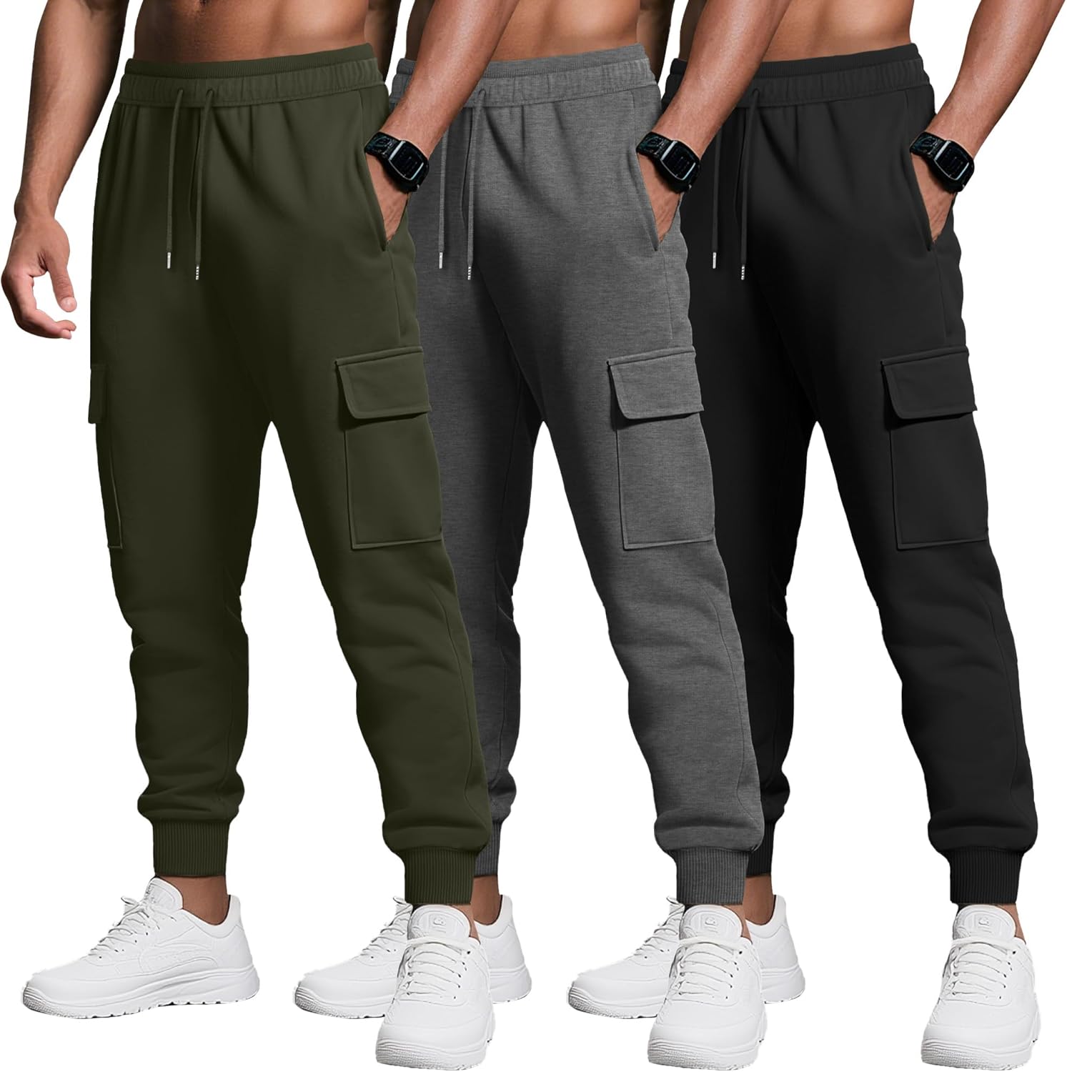 3 Pack Men's Cargo Joggers Baggy Sweatpants Athletic Tapered Lightweight Drawstring Workout Pants with Pockets