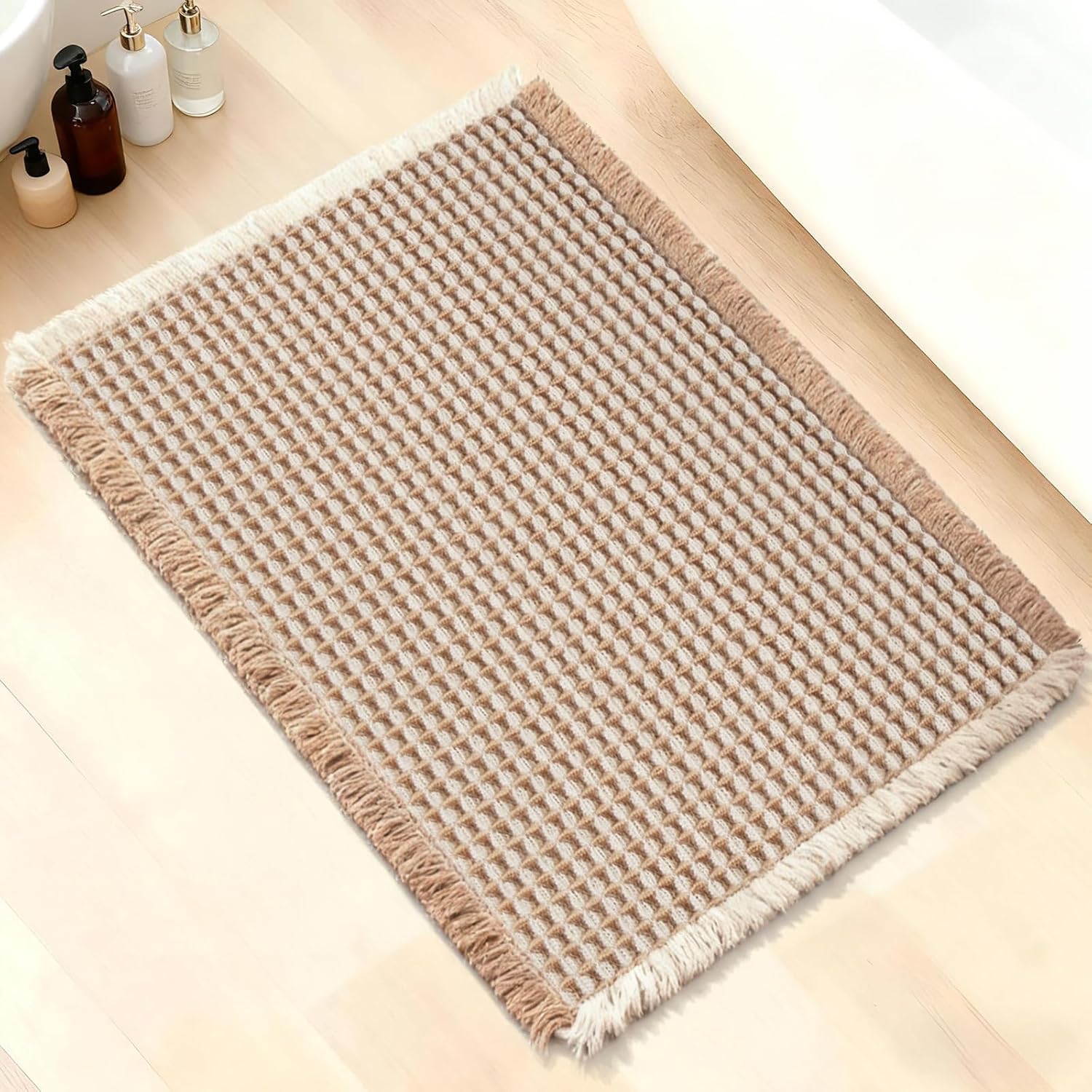 ArtyCozy Waffle Bath Mat, Super Absorbent Soft Non-Slip Boho Bath Rugs with Flat-Woven Hot Glue Backing for Bathroom, Machine Washable Bath Mats, 17" × 24", Brown & White