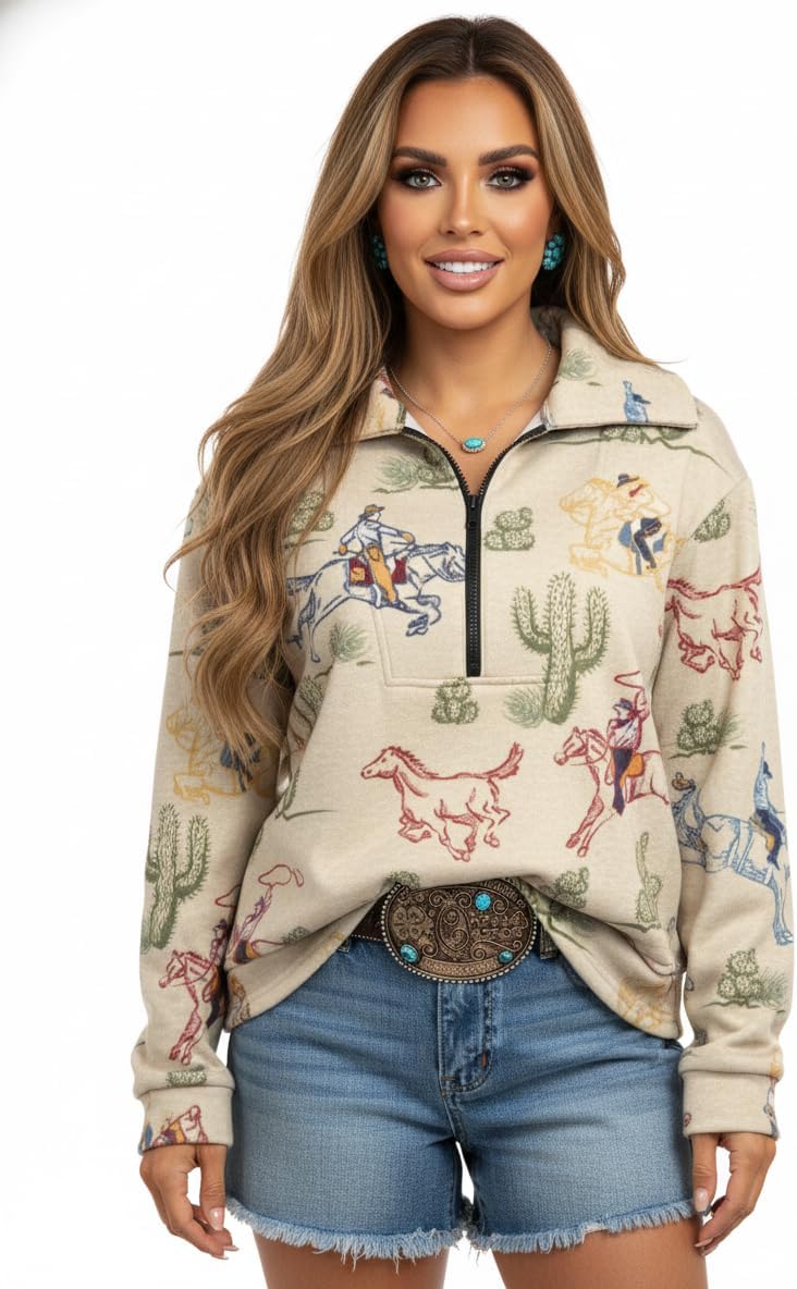 OSCORP Women's Western Rodeo Beige Half Zip Up Hoodie Sweatshirt Casual Long Sleeve Oversized Pullover Top
