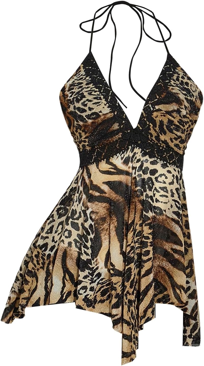 Women's Leopard Halter Top Vintage Cheetah Flowy Tie Backless Asymmetrical Camisole Tops Party Club Going Out Outfits