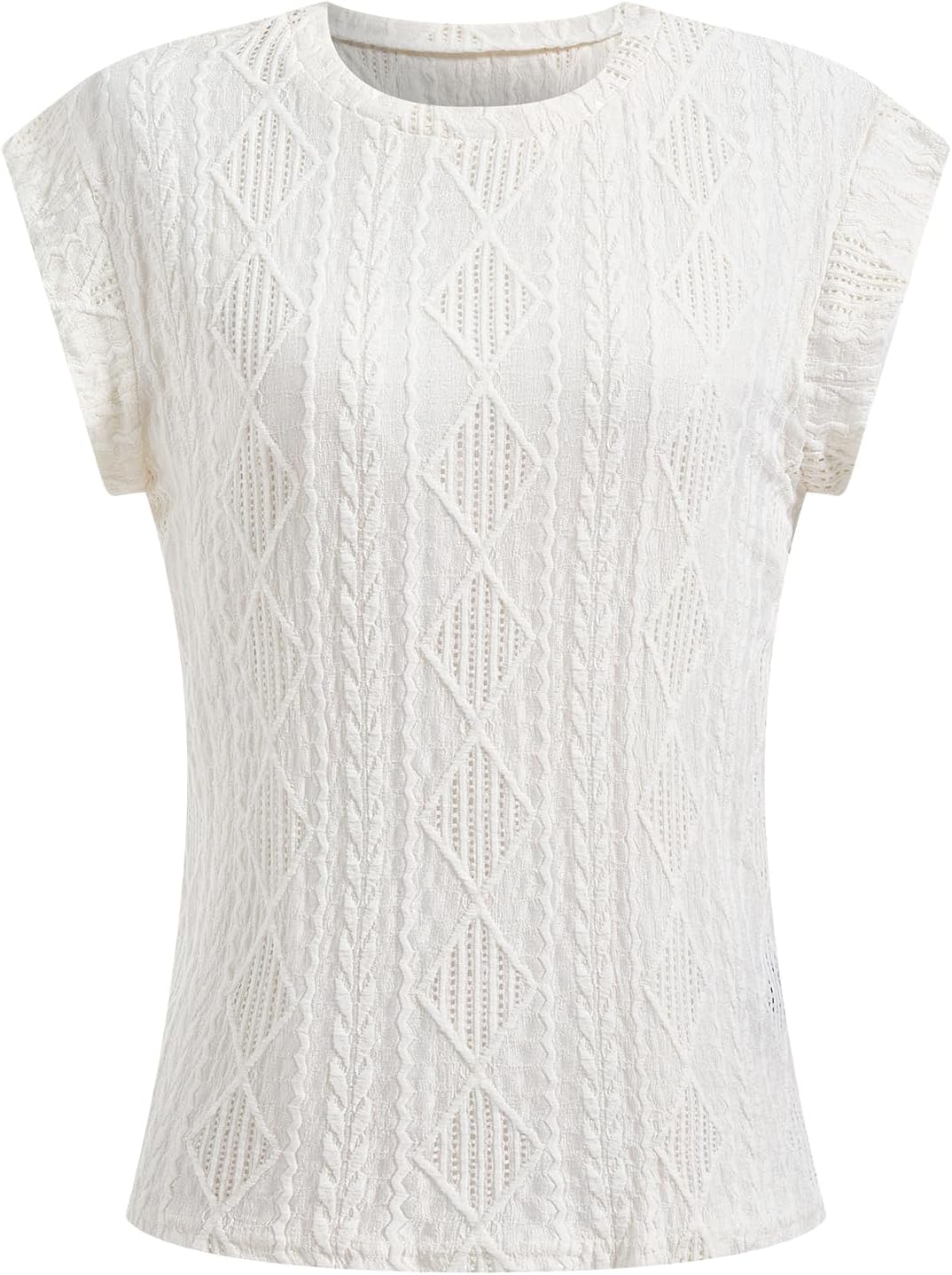 Women's Cap Sleeve T Shirt Crew Neck Hollow Out Knit Dressy Casual Tops