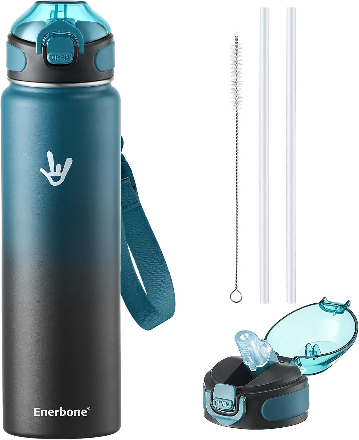 Enerbone 32 oz Insulated Water Bottle, Stainless Steel Bottle with Carrying Strap, Double-Wall Vacuum Insulation Design, Leakproof Sports Bottle with Straw, Keep Drinks Cold or Hot for Hours