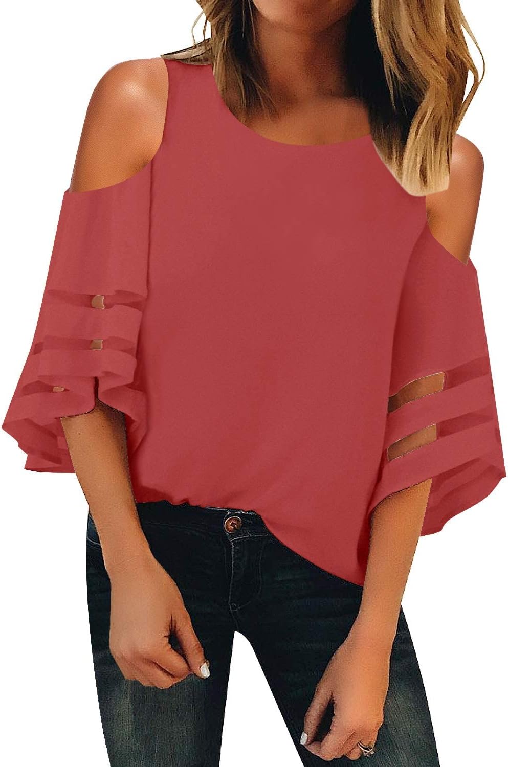 LookbookStore Women's Cold Shoulder Loose Shirt Tops 3/4 Bell Mesh Sleeve Blouse