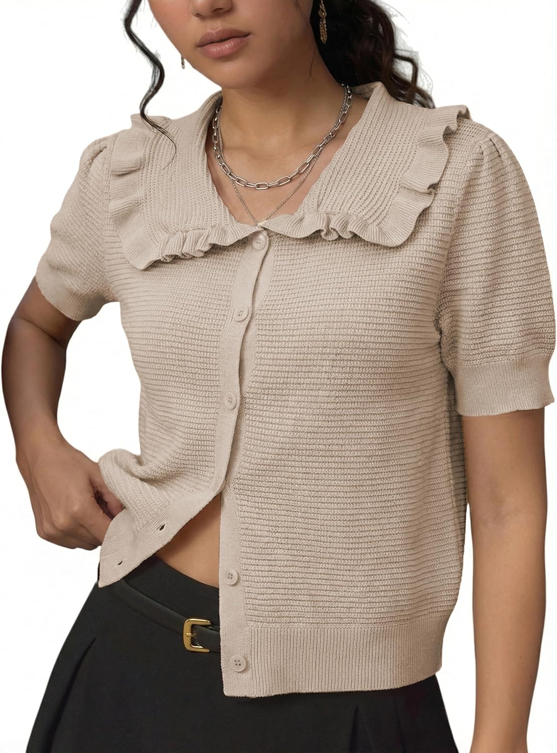 Watashi Womens Short Sleeve Cardigan Casual Button Down Ruffle Collared Lightweight Knittwear Summer Sweater Top